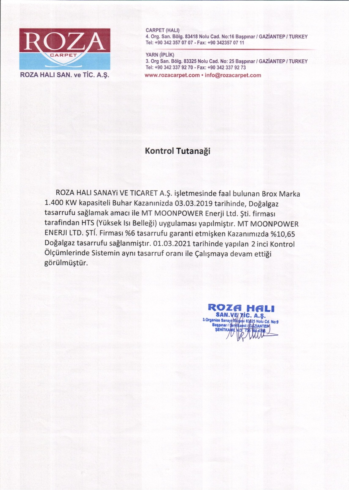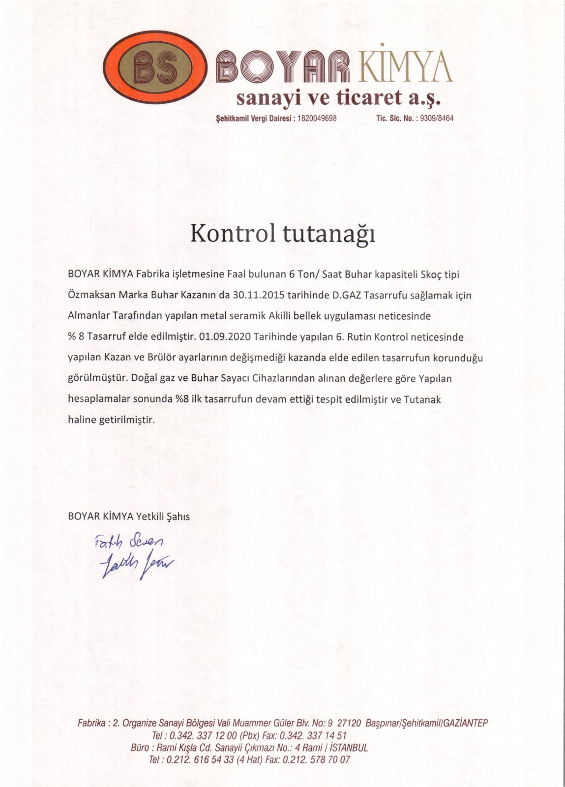 GAZİANTEP HAVA ALANI DEVLET HAVA MEYDANLARI İŞLETMESİ BOYAR KİMYA - Kontrol TutanağıÇAPAN TEKSTİL - İş Bitirme Belgesi